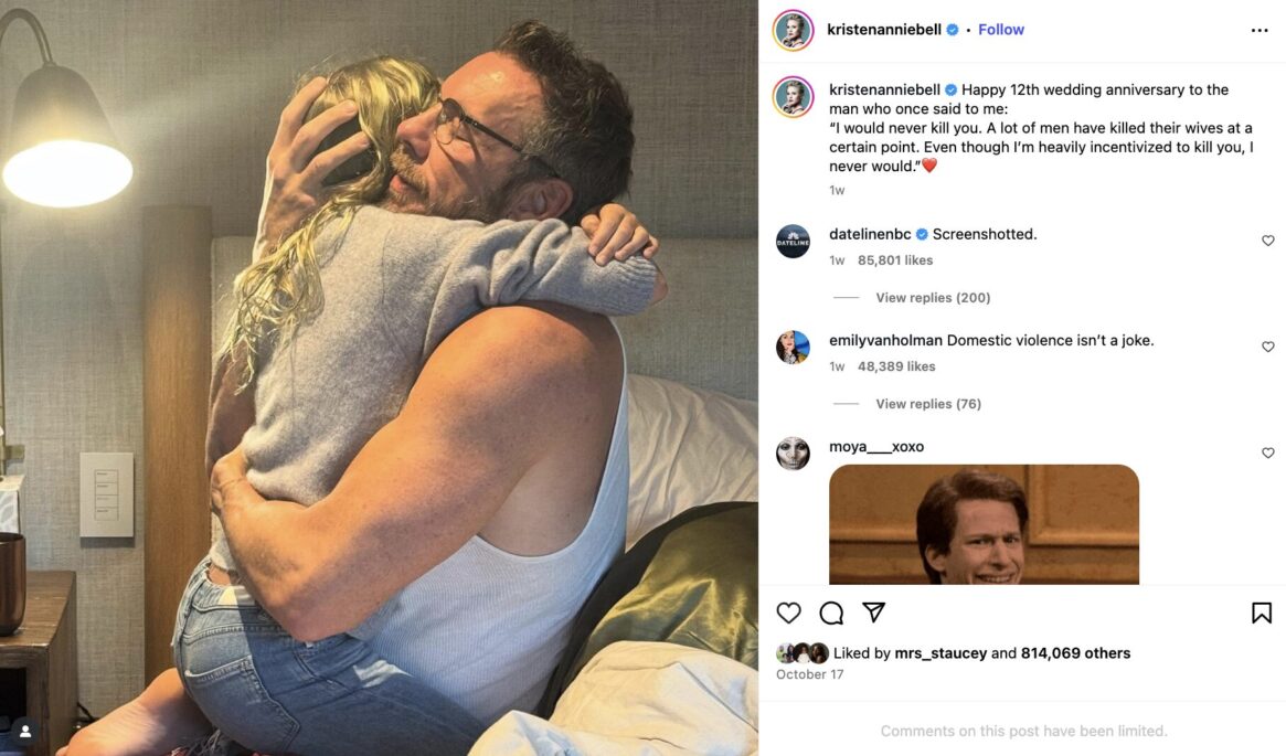 “Happy 12th wedding anniversary to the man who once said to me, ‘I would never kill you. A lot of men have killed their wives at a certain point. Even though I’m heavily incentivized to kill you, I never would,” the “Veronica Mars” alum wrote in her caption on Saturday, Oct. 18.